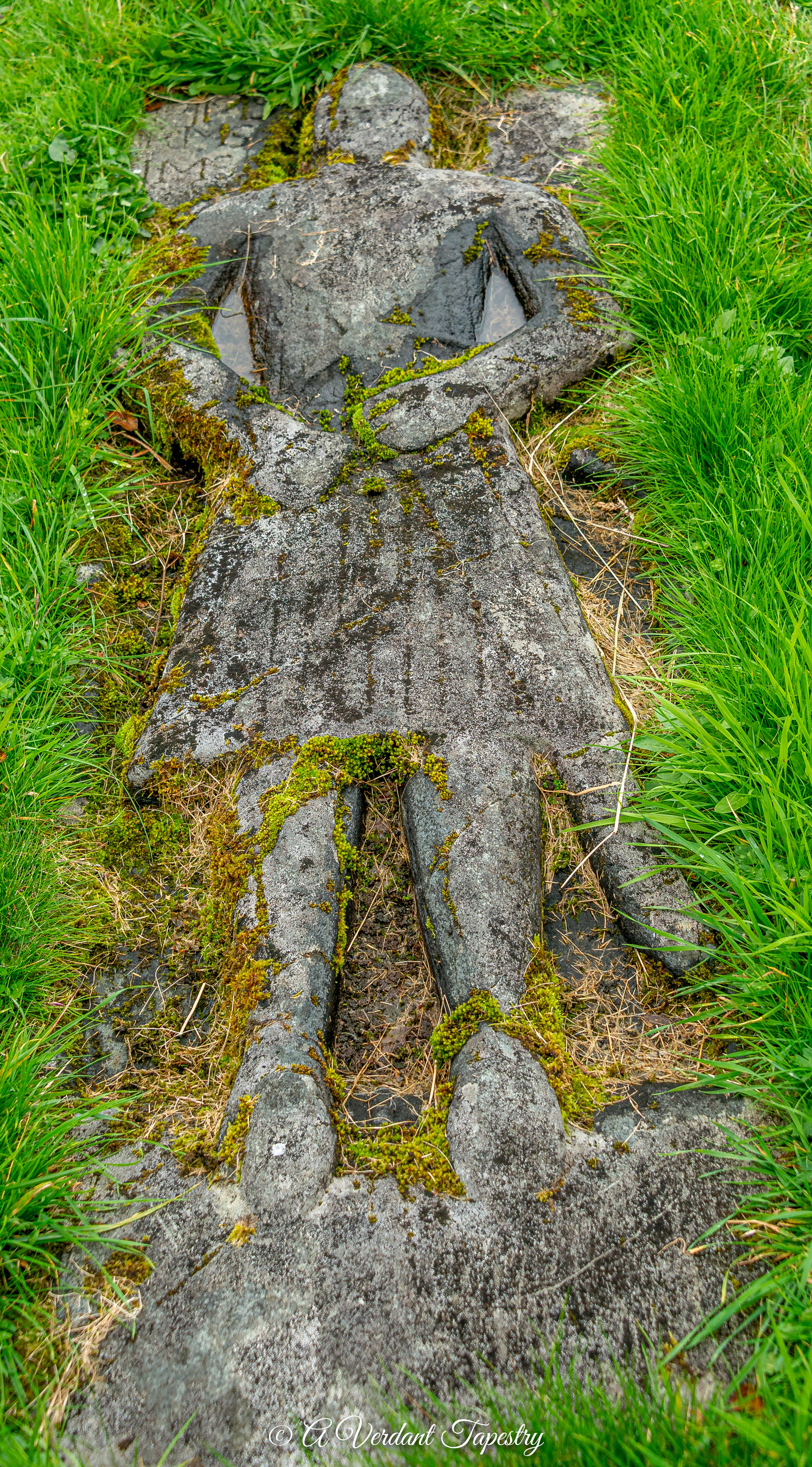 Not all graves belong to chiefs though, the graveyard also features several examples of high-status warrior graves. These are often misreported as either “Gallowglass (mercenary warriors)” or “crusader graves”, although this is almost certainly a romanticism; therefore, it should not be taken at face value. These warrior graves are some of the best surviving effigies in the Hebrides. These are carved in a typical west highland style, which was used for over two centuries from the 14th to the 16th, featuring warriors in quilted coats, bascinets (open-faced helmets), and banded mail, with hilted swords. They are very similar to the carved tomb of Alexander MacLeod of Harris, found in St Clement’s Church, Rodel, on Harris, which at first glance (and as some have speculated) would suggest the same craftsman. However, with dating issues, it is hard to prove since three of the Skeabost tombs could date as early as the 14th century. Although the fourth, known as the Nicolson Effigy, found inside Nicolson’s Aisle, depicts its figure with a claymore, certainly dating it to the 16th century, which is a similar date to the Rodel tomb.